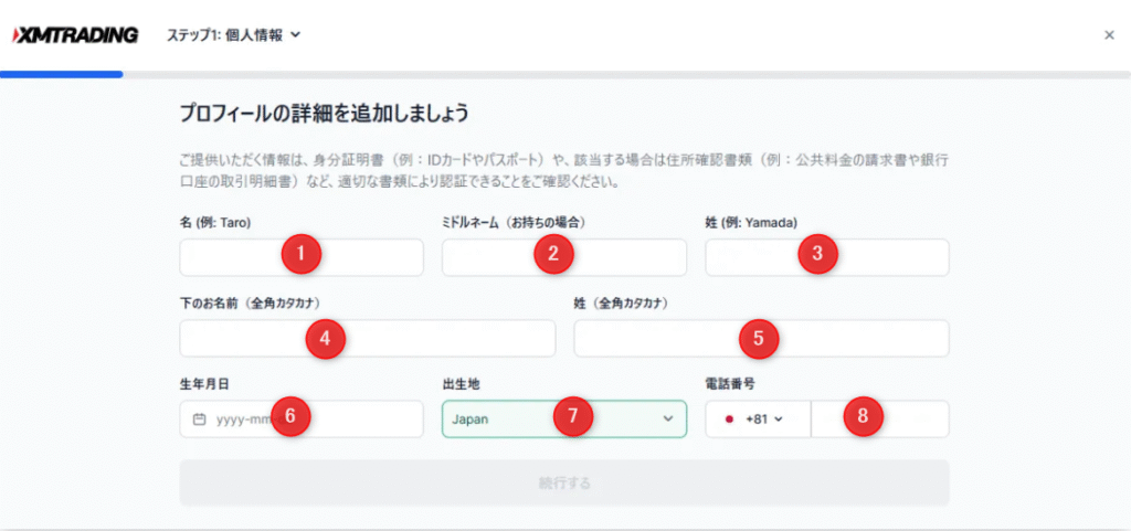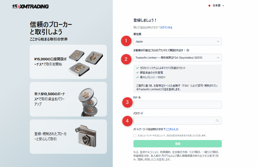 まずは、XM公式サイトでプロフィールを作成します。スマホ・PCどちらからでも登録可能です。