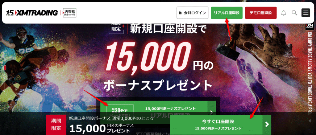XMの口座開設ページ(公式サイトはこちら)を開き、緑のボタンをクリックします。(どのボタンからでもボーナスは付与されます。)