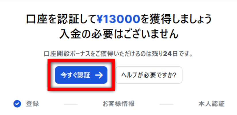 有効化を行わないとボーナスの受け取りや取引ができないため、以下の手順に沿って早めに手続きを完了させましょう。