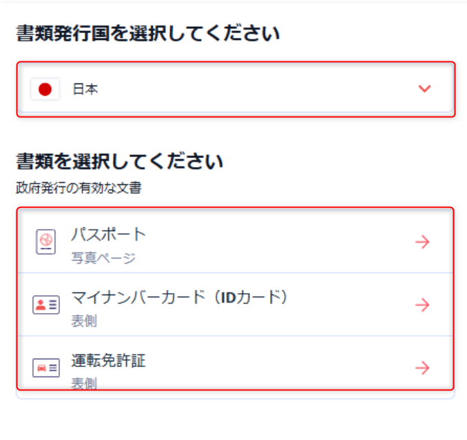 ここで、身分証明書の発行国を選択し、以下の3種類の中から提出する書類を選びます。