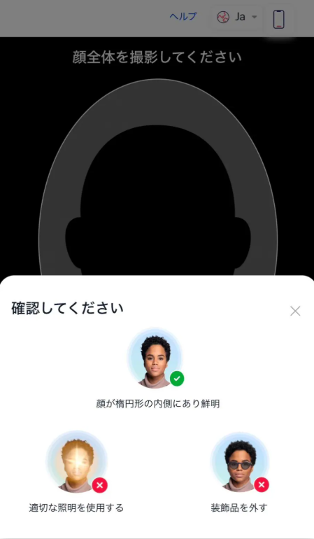身分証明書の認証が完了すると、次に顔写真の撮影画面が表示されます。