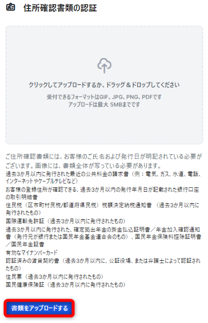 続いて、住所確認書類をアップロードします。以下の書類のいずれかを使用可能です。